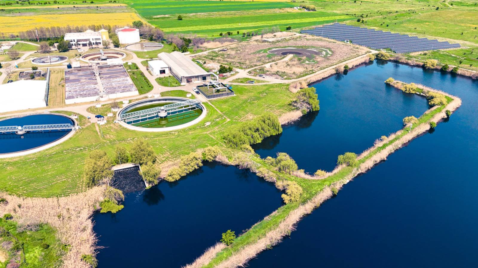 Stația de epurare se desfășoară ca un mecanism viu în mijlocul peisajului. Bazinele circulare, canalele sinuoase și structurile tehnice compun o simfonie vizuală a apei în transformare.