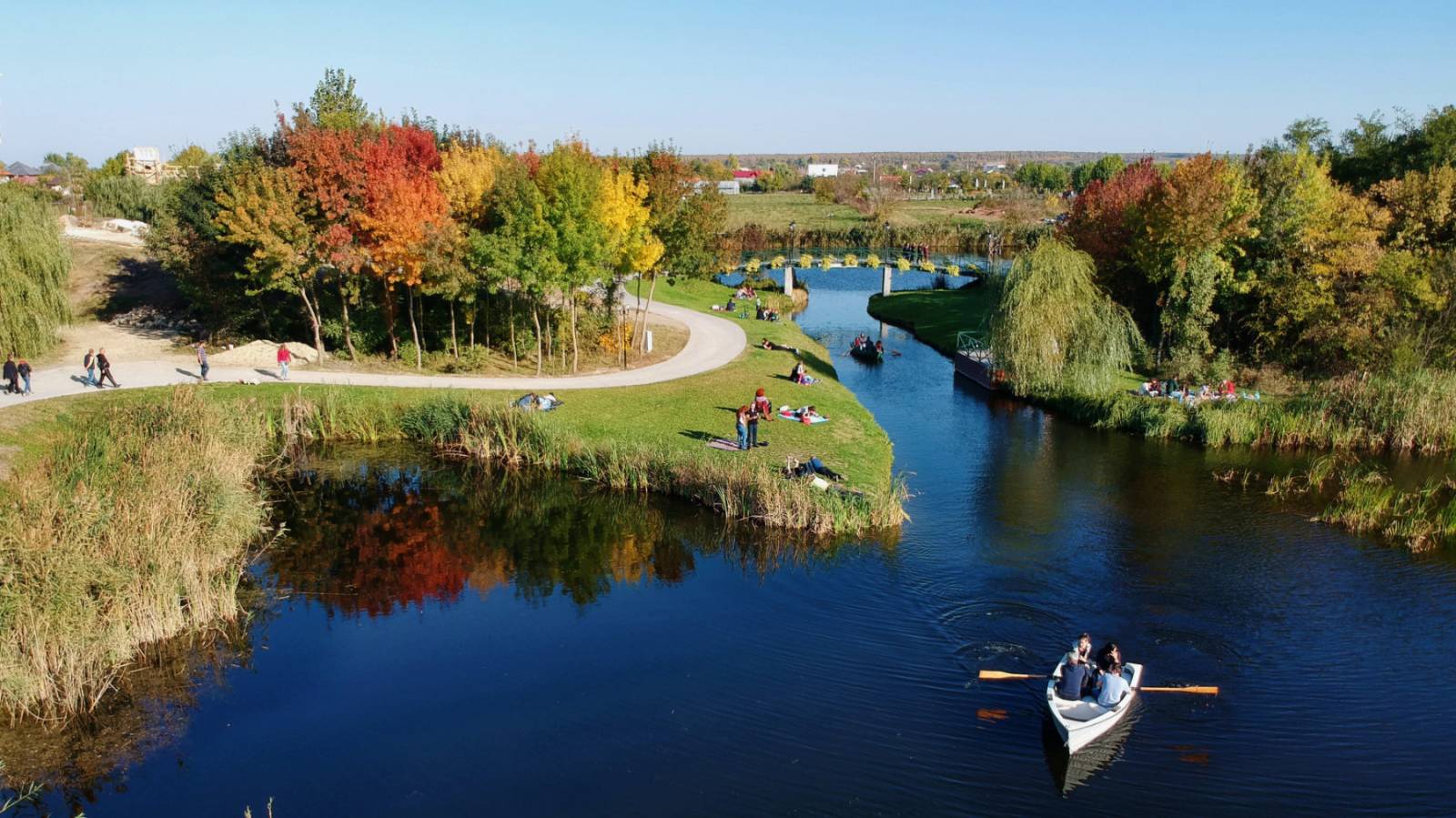 Peisaj de toamnă realizat cu drona in delta Comana. Imaginea surprinsă a fost realizată toamna, cerul senin, copacii multicolori, natură și apă cristalină- mediul perfect pentru relaxare.