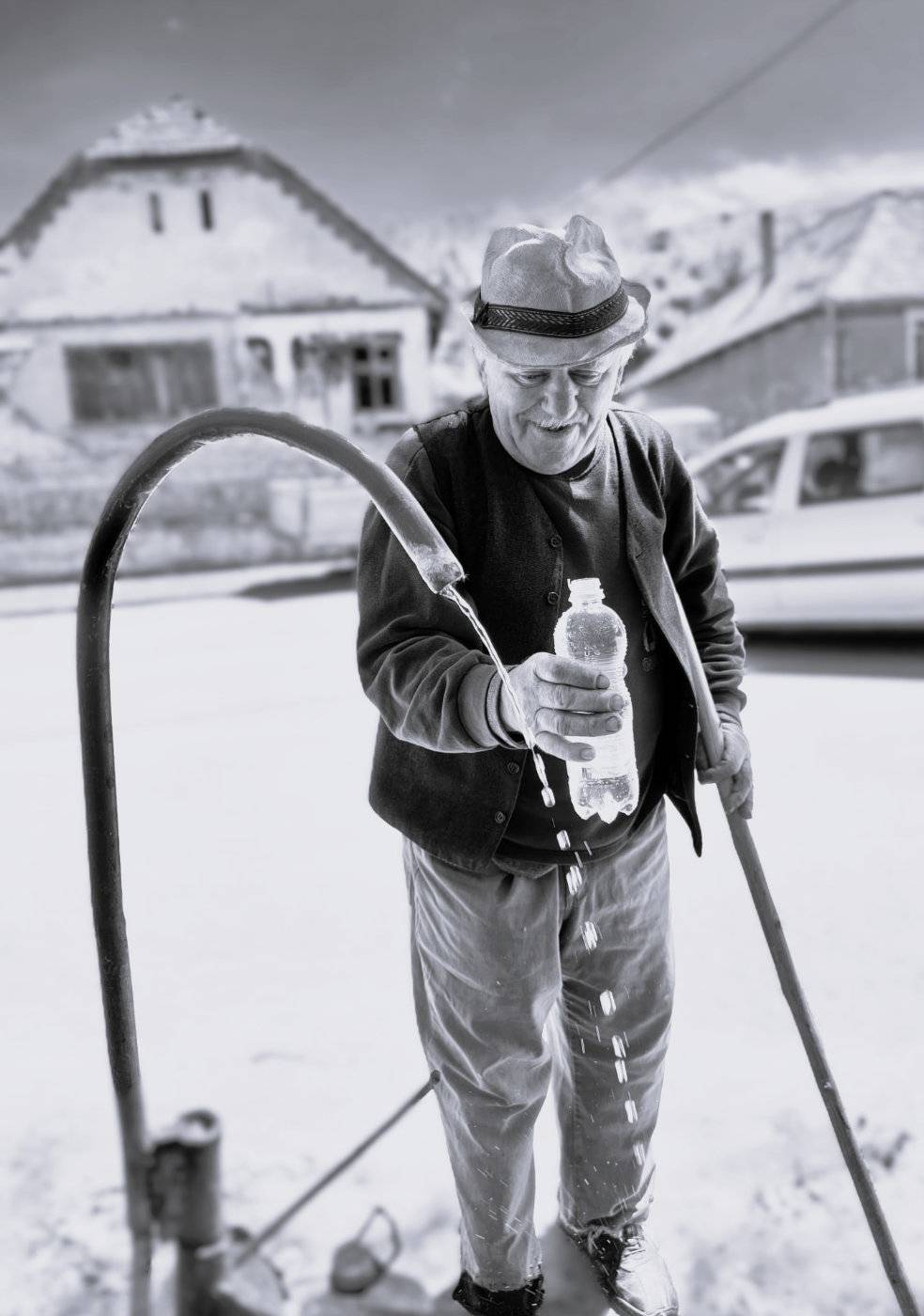 "Bucuria picaturii", este imaginea batranului simplu, cu chip brazdat de vreme, pentru care picatura de apa care curge limpede reprezinta darul pretios ...reprezinta viata.